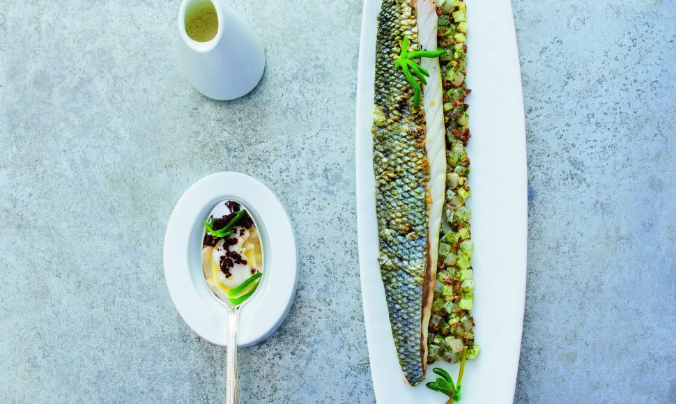 Préparez le loup en retirant le ventre et les arêtes qui sont sur le dessus et qui vont jusqu’à l’arête centrale. Ne l’écaillez pas, mais retirez la tête. Réservez la tête, les arêtes et le ventre pour la suite.