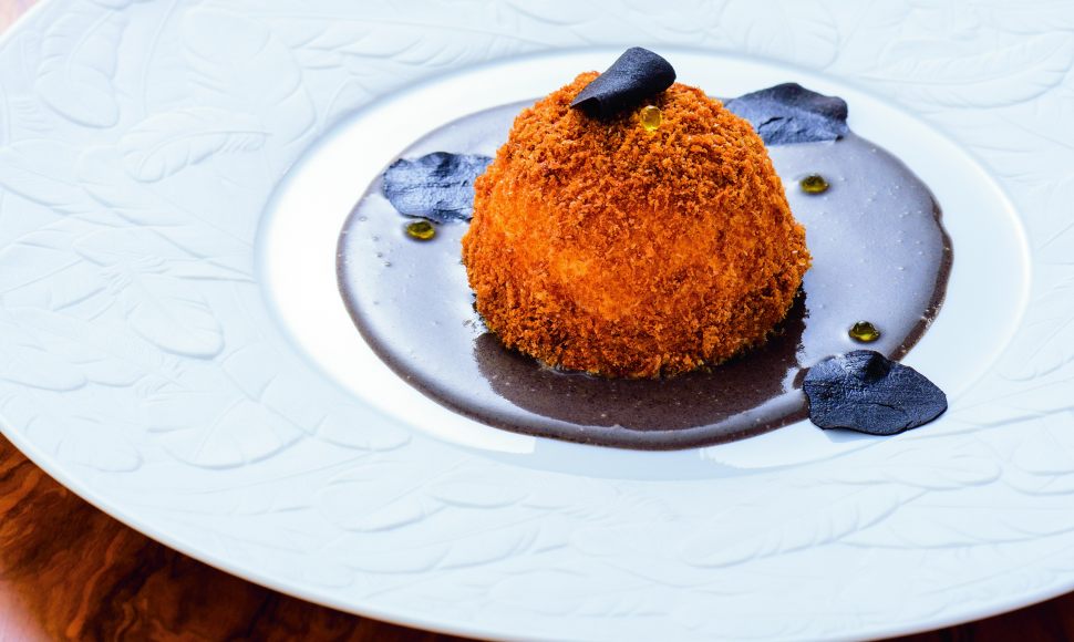C’est le premier plat que j’ai fait quand je suis passé chef au Château Saint-Martin. Dans une carte, selon moi, il devrait toujours y avoir un œuf et j’avais vraiment à cœur de le travailler dans une entrée. On peut faire des milliers de choses avec des œufs ! J’ai appelé ce plat le Mystère de l’œuf, en rapport avec le mystère glacé, ce fameux dessert que l’on connaît tous.