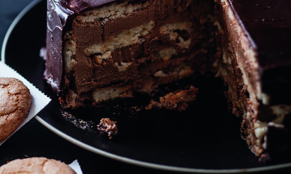 Écrasez à la fourchette le beurre avec le sucre, puis fouettez 1 min avec un fouet électrique jusqu’à ce que le mélange mousse légèrement. Pendant ce temps, faites fondre le chocolat au bain-marie et versez-le dans un grand saladier, faites tiédir le lait. Dans un autre récipient, mettez les 2 jaunes d’œufs, puis versez le lait, tout en fouettant. Incorporez au chocolat, puis versez le tout sur le mélange beurre-sucre. Fouettez au fouet électrique quelques instants. Versez un tiers de la crème ainsi obtenue dans le moule, couvrez d’une couche de macarons imbibés, toujours côté plat vers vous. Versez un autre tiers de crème, une autre couche de macarons, puis recommencez une dernière fois en terminant par les macarons. Couvrez de film alimentaire, puis posez par-dessus une assiette plane et un poids de 500 g. Mettez au frais 1 nuit au moins, 24 h dans l’idéal.