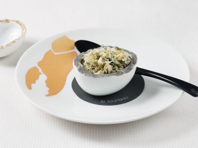 Lors du festival Taste of London de l'année dernière, Frédéric Simonin qui officiait alors chez Joël Robuchon à Londres avait remporté un franc succès avec cette entrée rafraîchissante. Le public avait été séduit par ce tourteau finement assaisonné adoucit par une délicate gelée de tomate et un avocat travaillé en guacamole. Une recette que le chef a choisi de partager avec le public français pour le salon Taste of Paris 2015.