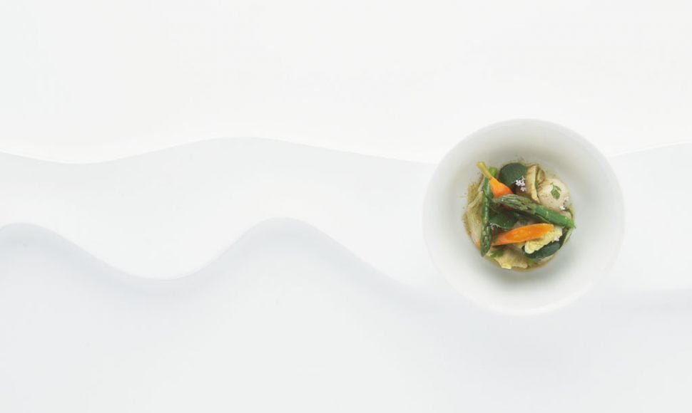 Dans cette recette exclusivement légumière, Alain Ducasse choisit de marier le navet et carotte fanes, le fenouil, les artichauts poivrade et les asperges, avec une pointe de vanille en vinaigrette. Une cuisson au sautoir avec des épices, herbes et du vin blanc, le tour est joué !