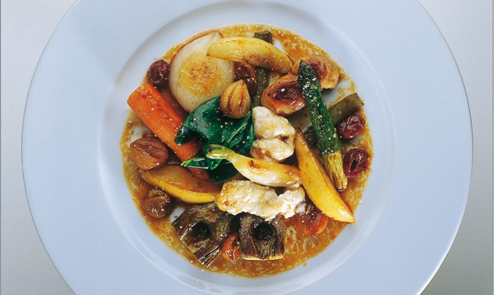 Légumes d’hiver cuisinés à l’étouffée en cocotte noire, amourettes et ris d’agneau