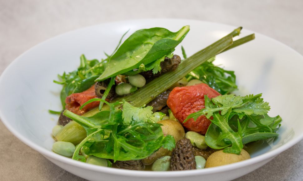 Fenouils, pommes de terre grenaille, févettes, oignons tiges, morilles... Le printemps tout entier s'invite dans votre assiette. Ils sont ici accompagnés d'une salade à la grecque pour apporter croquant et fraîcheur. A vous de déguster.