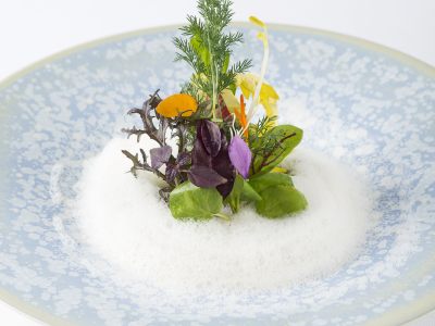 Plat signature de son restaurant, le chef Kei Kobayashi a choisi cette recette tout en légèreté. Les légumes en constituent l’élément phare et sont subtilement mis en valeur par une mayonnaise aux anchois et olives. L’intérêt de ce plat, nous dit le chef, est qu’il évolue au gré des saisons, et de ce que la nature offre alors comme légumes. Tomates, betteraves, carottes, les déclinaisons sont infinies. A noter que la sobriété de ce plat est magnifiée par certains détails comme une espuma de roquettes et yaourt qui vient en finesse accompagner les légumes et le tendre saumon.