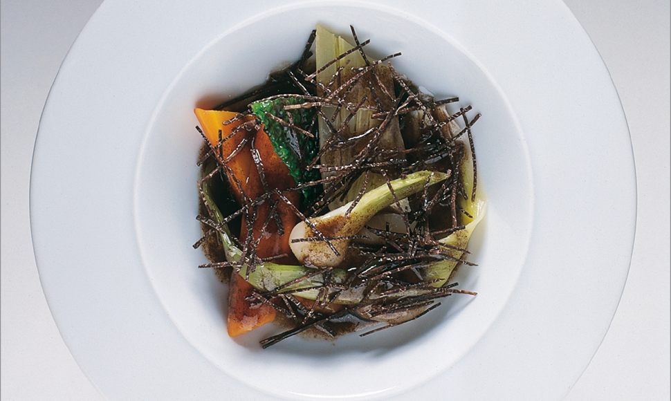Légumes des paysans cuits au bouillon de pot-au-feu en vinaigrette au fumet de truffe