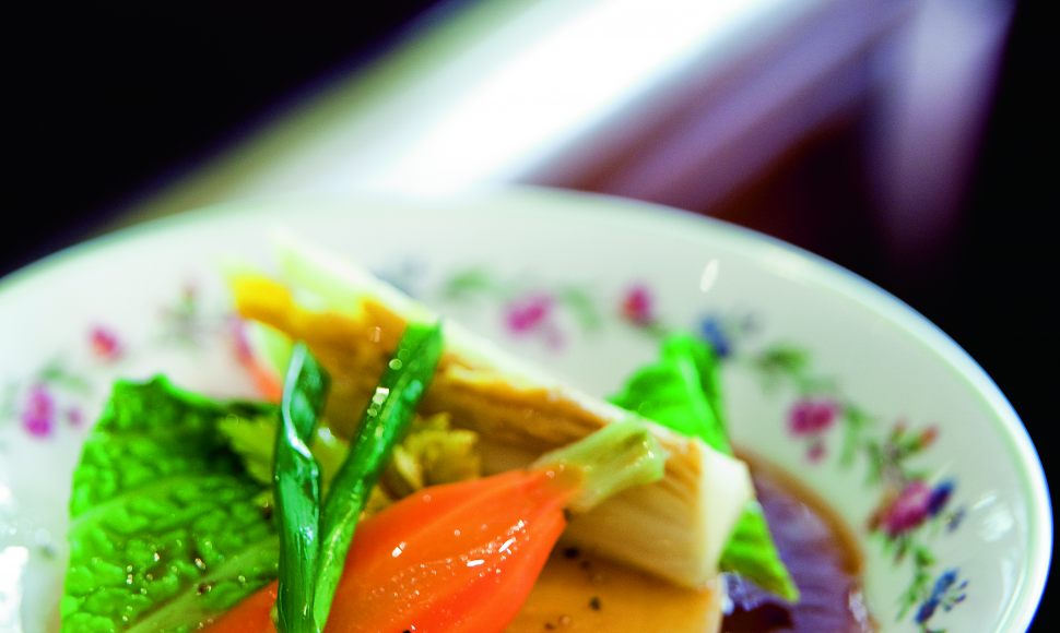 Légumes des paysans cuits au bouillon de pot-au-feu, vieux vinaigre et fleur de sel