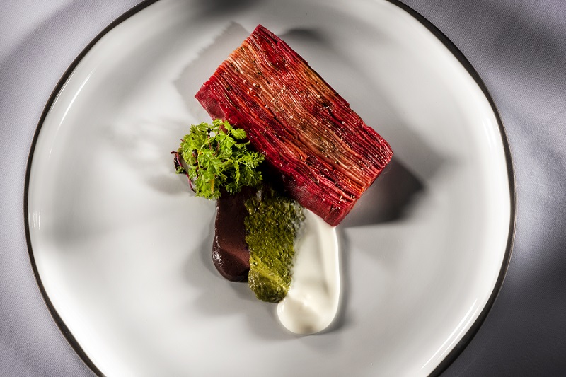Éplucher les légumes et les tailler à la mandoline le plus finement possible et les réserver séparément. Monter dans un cadre les légumes variété par variété en couches successives et bien assaisonner entre chaque couche (sel, poivre, coriandre effeuillée, vinaigre balsamique et huile d’olive). Ainsi, répéter l’opération autant de fois que nécessaire afin de remplir le cadre. Mettre sous presse pendant 12 heures.