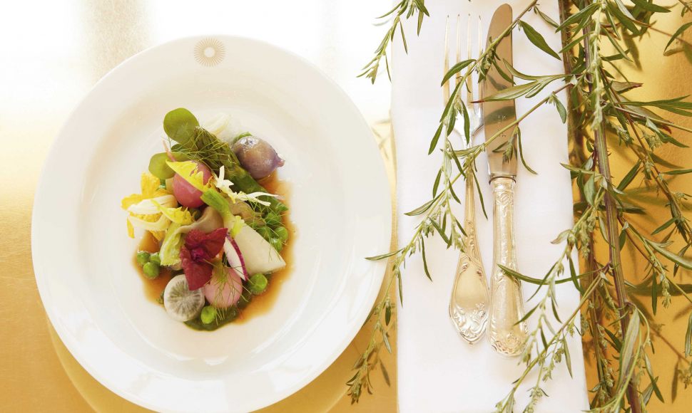 Dans une cocotte avec de l’huile d’olive, faites cuire tous les légumes – sauf les artichauts, les asperges et les petits pois – avec ½ gousse d’ail en chemise et 1 branche de thym à couvert afin de faire sortir l’eau de végétation. Assaisonnez et ajoutez le fond blanc sans trop les mouiller et faites-les cuire jusqu’à ce qu’ils soient fondants, environ 15 min. Au bout de 8 min de cuisson, ajoutez les pointes d’asperges. Les petits pois doivent être cuits seulement 1 min.