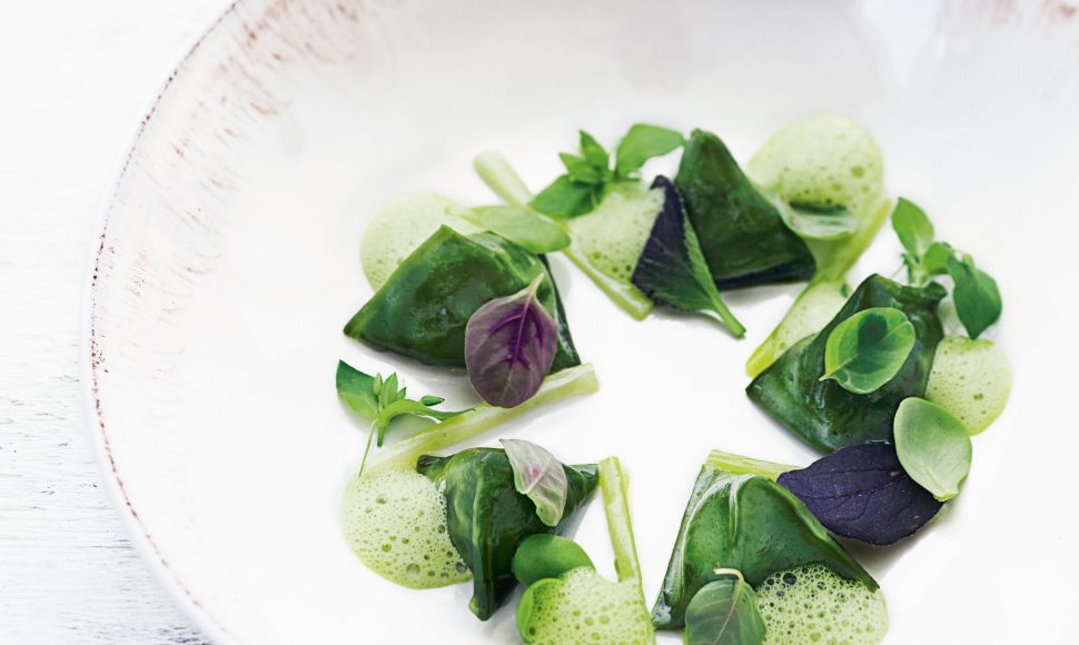 "Je souhaitais travailler une forme de pâte originale, gourmande et contemporaine à la fois. C’est ainsi qu’ont vu le jour ces berlingots, devenus un des plats phares de l’année 2013 dans mes restaurants. Véritable clin d’œil aux origines provençales de ma mère, j’associe le banon, célèbre fromage de chèvre AOC des Alpes-de-Haute-Provence, au thé matcha, à la bergamote, au cresson et au gingembre. Ainsi, le chèvre légèrement fumé associé à la sauce vive, acide et piquante, confère tout son équilibre au plat."