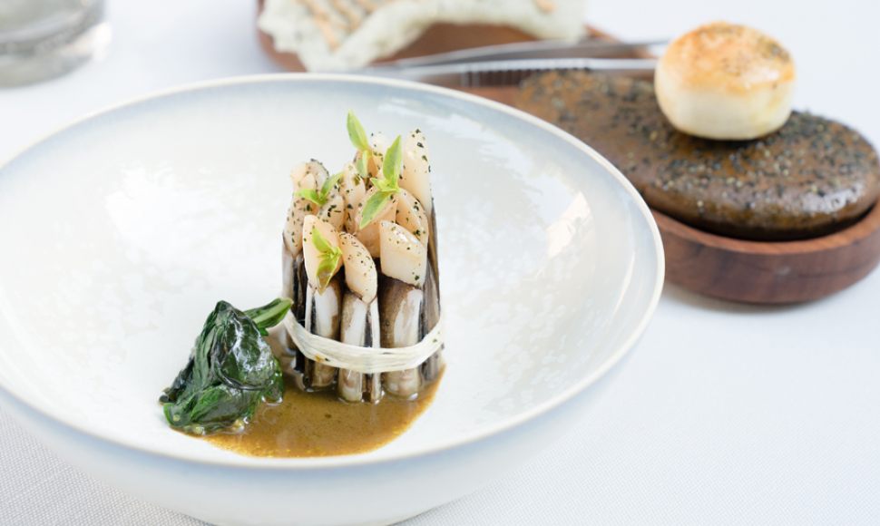 Un mariage terre-mer associant couteaux, chips de tapioca, pistou et pâte de pignons de pin.
