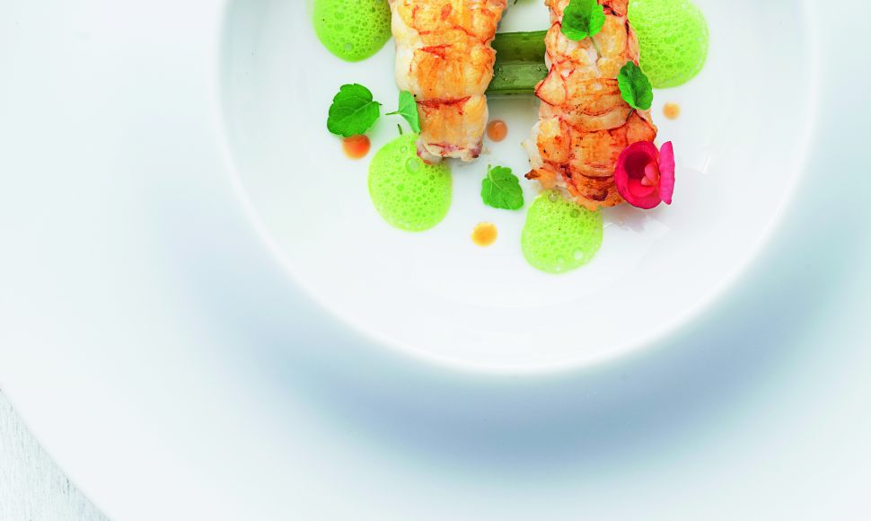 Les langoustines au casier saisies au beurre de crustacé, bouillon émulsionné à l’anis vert et à la feuille de cannelier