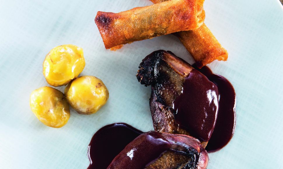Les palombes rôties cuisses en salmis croustillants, châtaignes