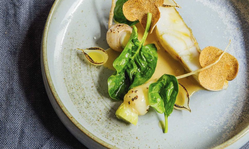 Lieu jaune, champignons de Paris, beurre blanc aux cèpes, navets et épinards