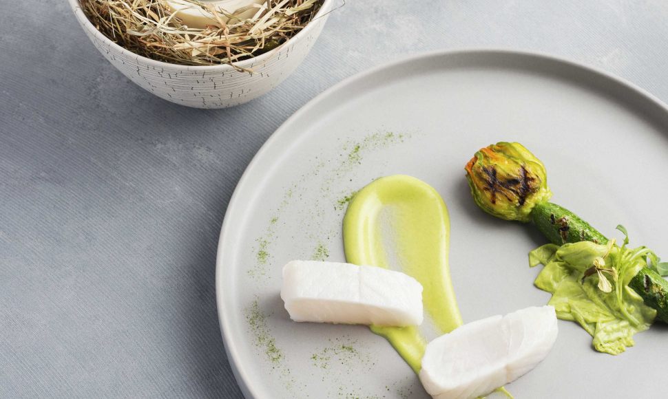 Le goût subtil de la courgette fleur se marie à la perfection avec le lieu jaune à la chair opalescente légèrement marinée au sel, puis snacké et assaisonnée à l'huile d'olive et au citron.