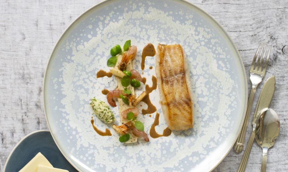 Lieu jaune de ligne, céleri, bouquets vivants au naturel, sauce whisky & café