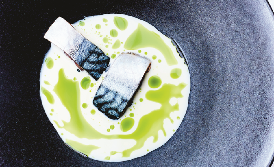 Ici, le maquereau est peu travaillé, comme l'aime le chef Christian Le Squer : les lisettes, c'est-à-dire de jeunes maquereaux, cuisinés avec du lait ribot et un pesto maison.