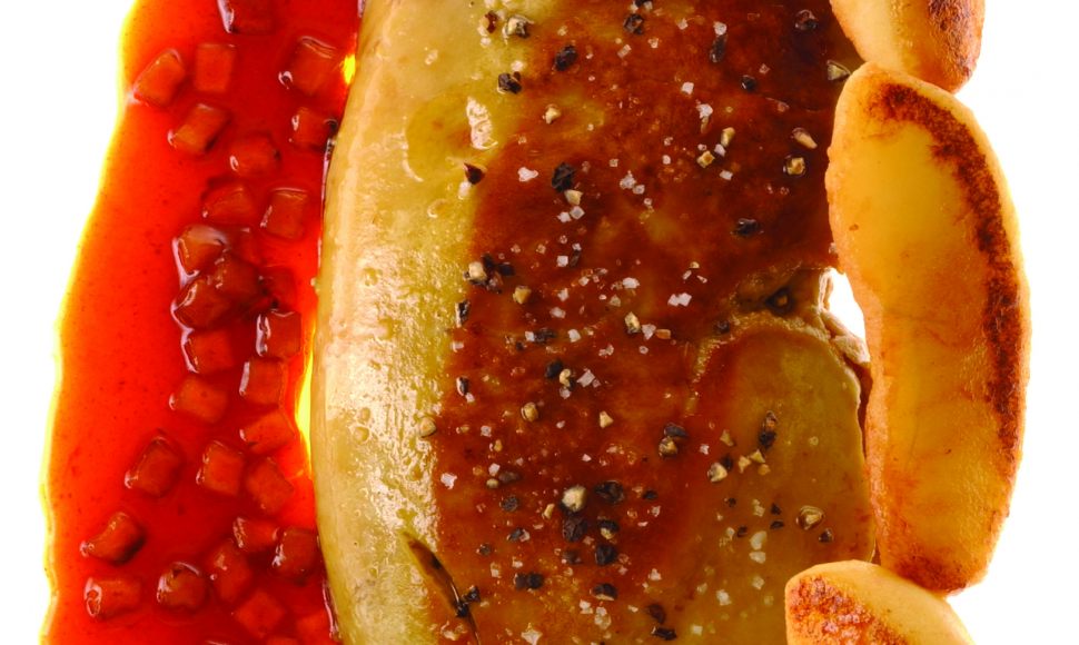 Lobes de foie gras rôtis en cocotte, pommes, raisin