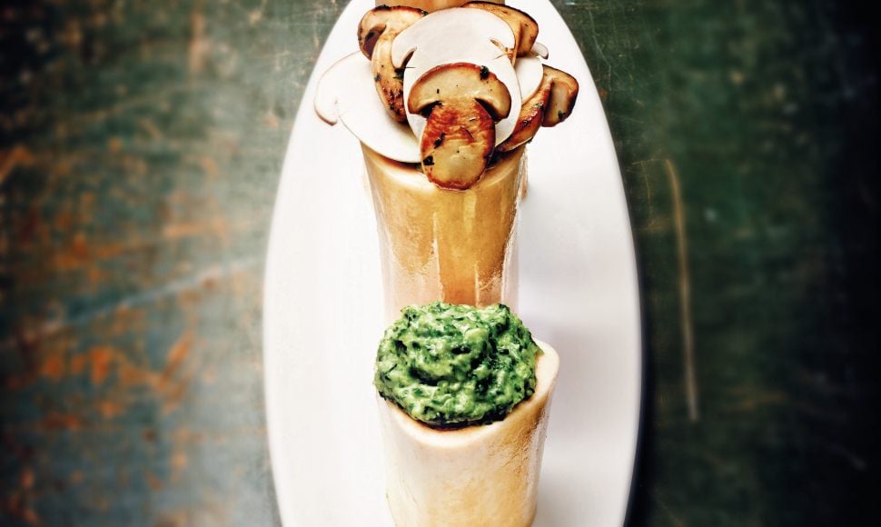 L’os à moelle l’un parfumé de poivre noir et grillé en coque l’autre farci d’une embeurrée de chou à l’ancienne
