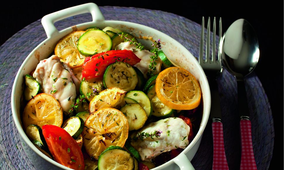 Coupez les tomates, les courgettes et le citron en rondelles. Répartissez-les sur et autour du poisson. Versez le vin, le reste d’huile et de thym. Salez et poivrez. Mettez au four pendant 45 min. Servez aussitôt avec du riz ou de la polenta.