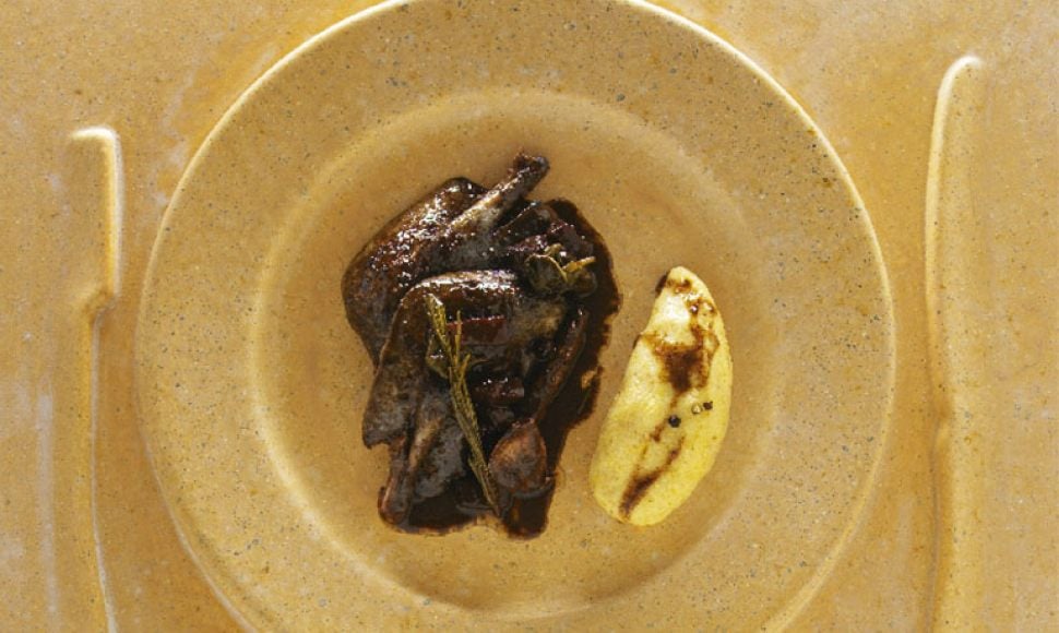 Nous nous sommes un peu éloignés des côtes méditerranéennes pour aller chasser sur les terres de l'Ombrie. Car cette recette de "Palombe allo spiedo, salsa ghiotta" dont nous nous sommes inspirés, correspond tout à fait à ce que nous aimons : des palombes simplement rôties, une sauce fine mais énergique. Nous les avons accompagnées d'une polenta.