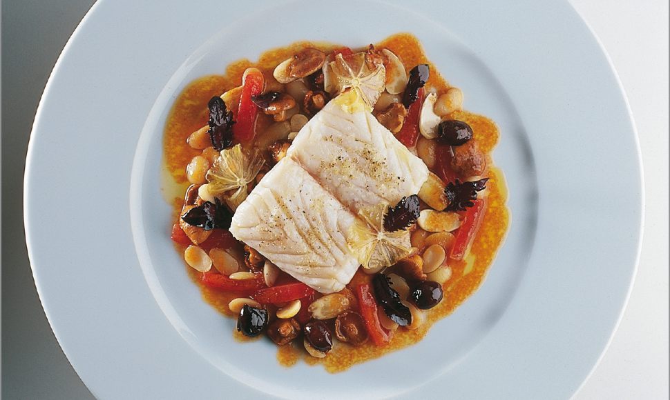 Loup de méditerranée cuit à la plancha et saucé de pulpe de tomates aux citrons du pays, haricots cocos du val nervia, amandes fraîches et girolles
