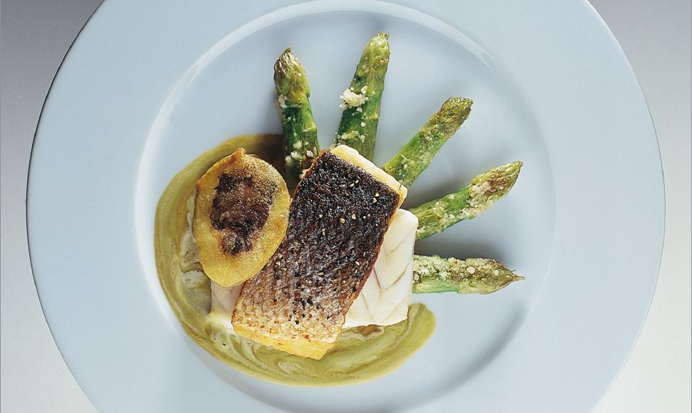 Loup de méditerranée en filet taillé épais, finement pané de poivre et de genièvre, la peau croustillante, fin beignet de pomme de terre fourré d’olives, asperges vertes, sauce liée à l’asperge