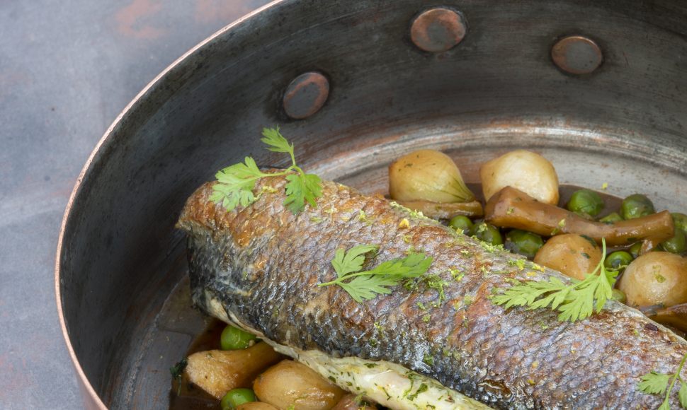 Loup de Méditerranée farci aux herbes fraîches, garniture printanière