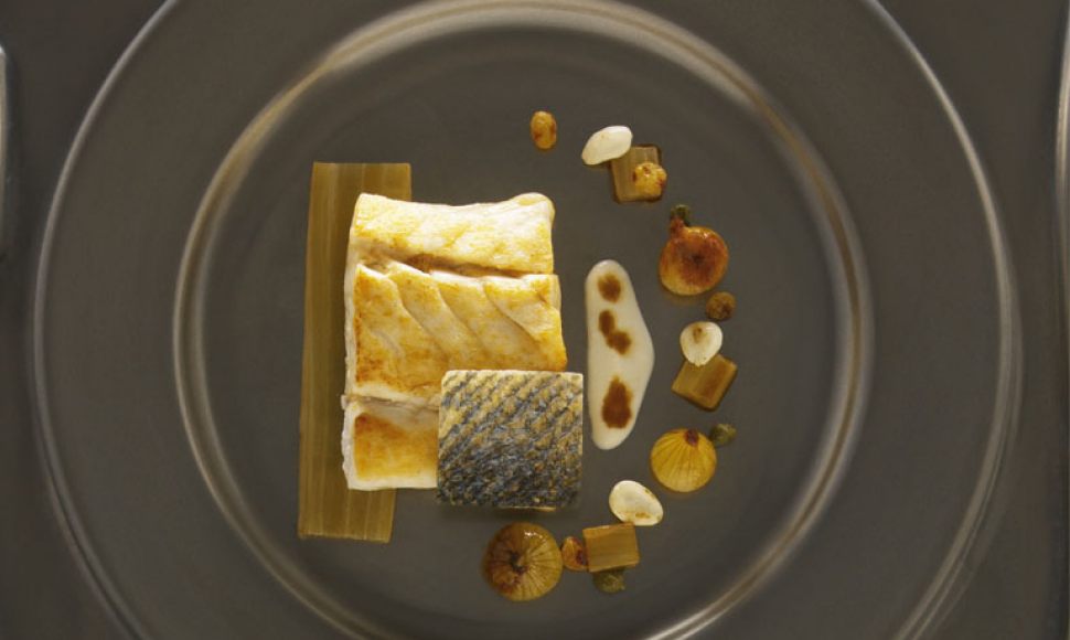 Loup de méditerranée poêlé aux amandes nouvelles, oignons grelots et raisins secs, blettes de nice