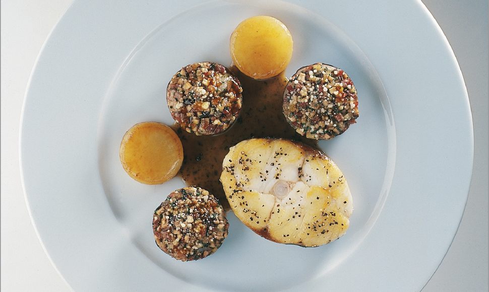 Loup en darne comme un tournedos au poivre rôti, un jus court aux truffes écrasées, pommes fondantes et têtes de cêpe en gratin