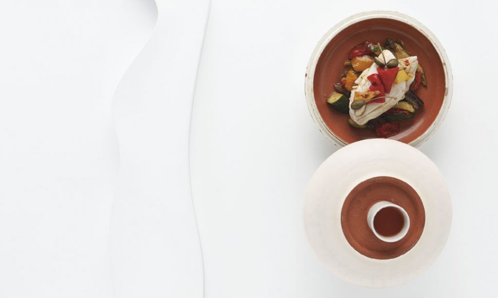 Loup frotté d’agrumes, chachouka en gros morceaux, sirop de tomate