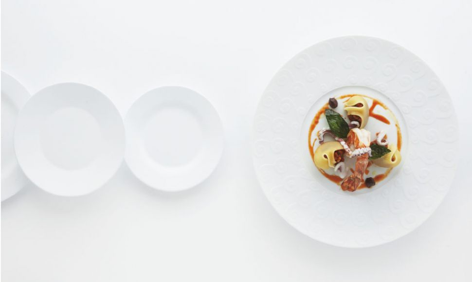 Lumaconi, bolognaise de calamars et gambas, jus aux tomates cerises
