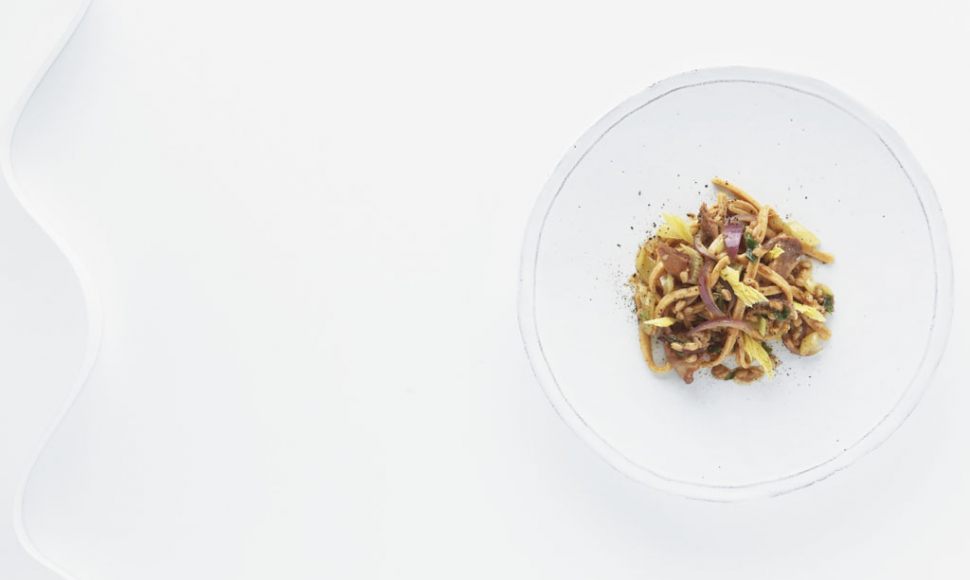 Lunghetti à la farine d’épeautre, épaule de lapin, céleri et oignon rouge de tropea