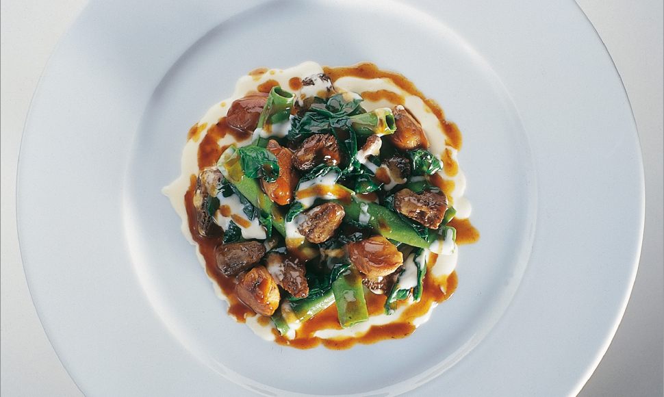Macaroni verde et morilles de l’arrière-pays à peine crémées, des sot-l’y-laisse de gros poulet fermier au poêlon, jus de rôti