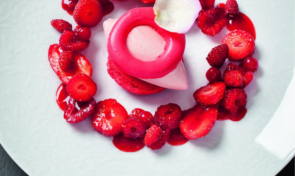 Disposez au centre une demi-coque de macaron retournée. Formez une belle quenelle de glace à la rose, puis déposez-la sur la coque. Ajoutez sur le dessus un anneau de macaron, décorez d’un pétale de rose cristallisé et servez aussitôt.