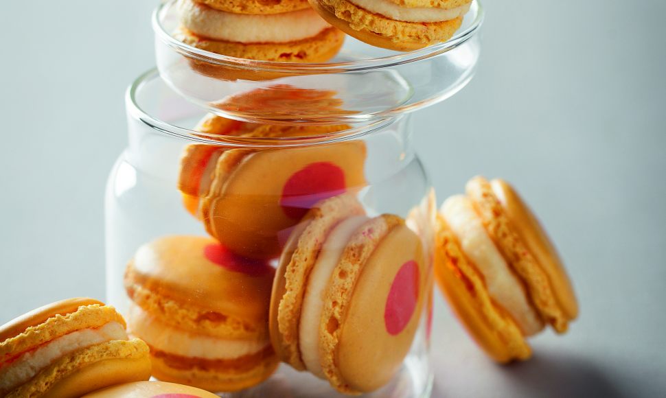 Préchauffez le four à 160 °C (th. 5). Réalisez la recette des macarons en ajoutant du colorant jaune. Réservez un peu de pâte et ajoutez du colorant rouge. Mettez la préparation jaune dans une poche munie d’une douille unie n° 7, puis dressez des macarons de 3,5 cm de diamètre sur une plaque. Faites un point orange sur les coques et enfournez pour 14 min. Laissez refroidir, puis réservez-les.