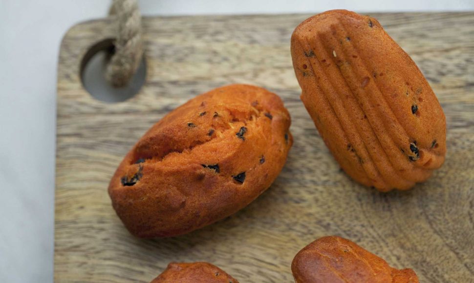 • Incorporez la farine et la levure tamisées, le beurre fondu, l’huile d’olive, le sel et le poivre. Ajoutez le colorant rouge, puis pochez 30 g de cet appareil dans chaque empreinte du moule à madeleines légèrement huilé. Enfournez et éteignez le four. Laissez les madeleines 4 min dans le four éteint, puis rallumez-le à 120 °C (th. 4) et poursuivez la cuisson environ 12 min. Vous obtiendrez alors une jolie bosse comme pour les madeleines sucrées.