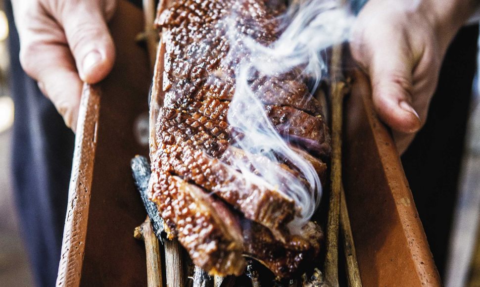 Cuisinez un magret de canard en gardant l'os afin qu'il conserve tout son jus, la cuisson se fait avec des sarments de vigne qui absorbent la graisse de canard afin d'obtenir un goût fumé particulier.