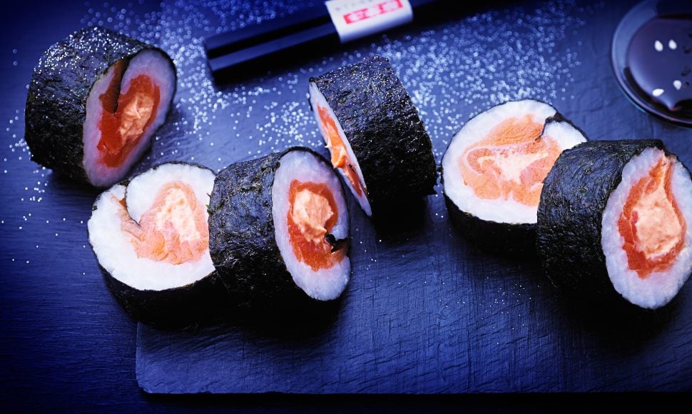 Sur un tapis en bambou ou du papier film, déposer une feuille d’algue nori et étaler une couche de riz très fine jusqu’aux ¾. Recouvrir avec les tranches de saumon fumé et sur les bords déposer une ligne de tarama.
