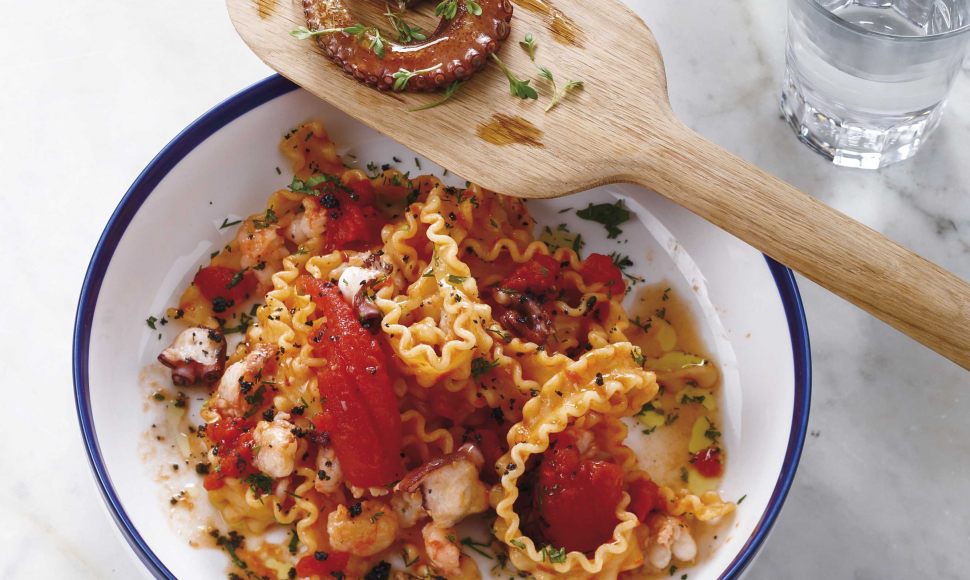 Des pâtes aux crustacés : poulpe, seiche, et crevettes accompagnées d'une sauce aux tomates cerises et de légumes : carotte, oignon et céleri.