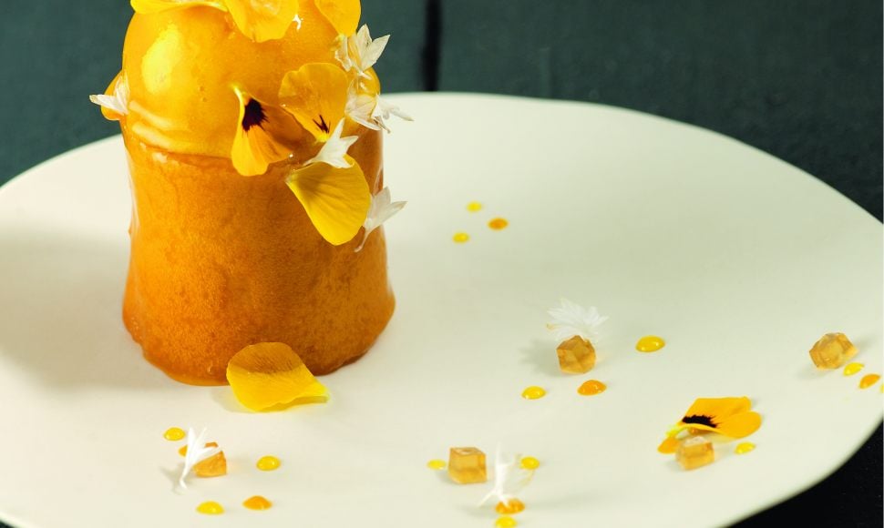 Mangue kent, baba infusé au rhum, crème légère à la vanille, mangue rafraîchie d’un sorbet