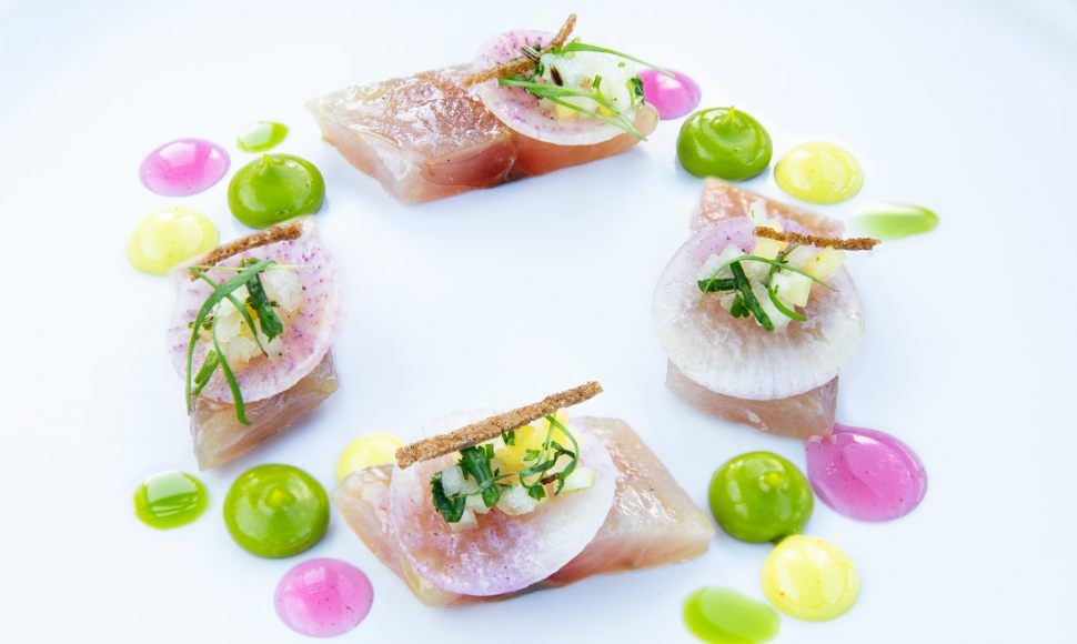 Préparer une marinade en mélangeant les ingrédients : jus de yuzu, jus de citron vert, zeste de citron vert et d’huile d’olive. Réserver.