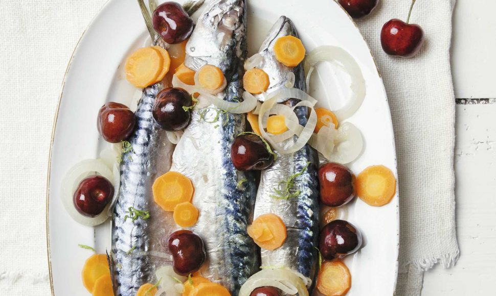 Des maquereaux accompagnés de carottes, cerises, oignons, échalotes...