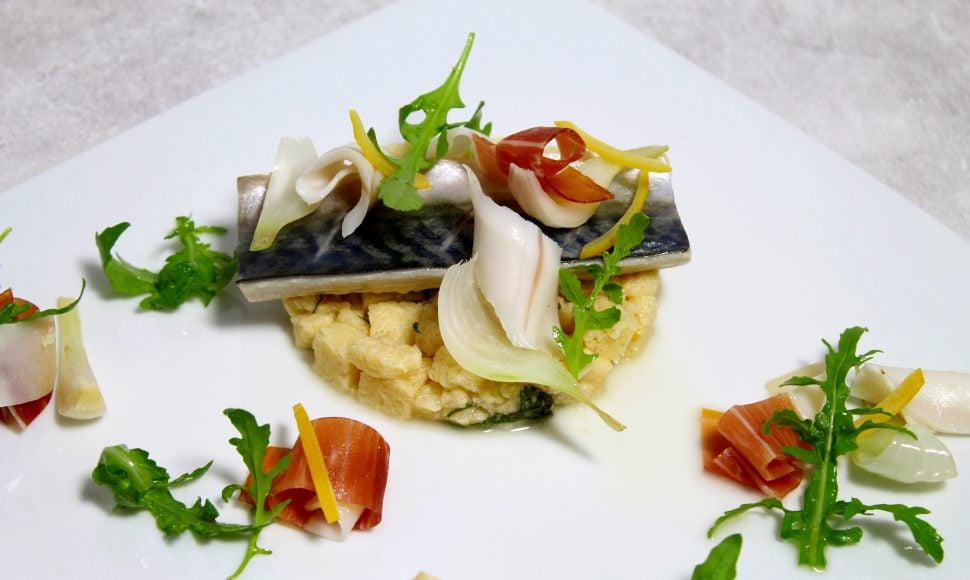 Maquereaux marinés au vin blanc, « panzanella in bianco » citron, lard, jambon, herbes