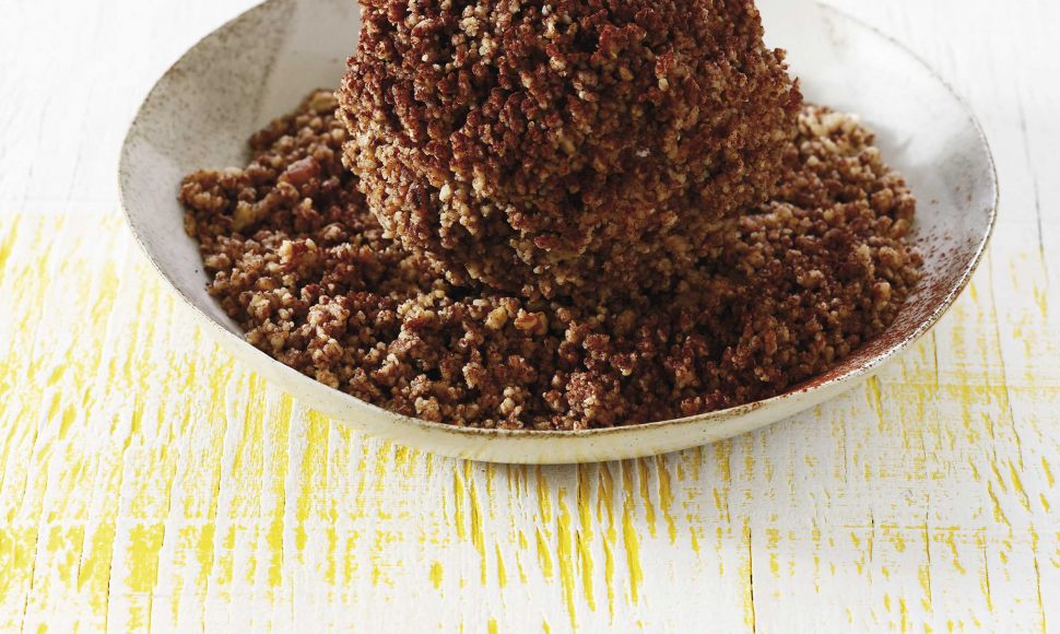 Une meringue avec un coeur praliné et ganache pécan, recouverte de morceaux de pécan et de cacao.