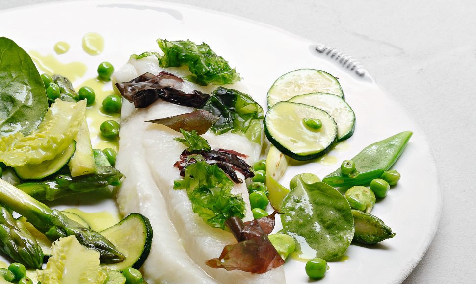 Merlan à la vapeur d’algues, légumes verts sautés à cru