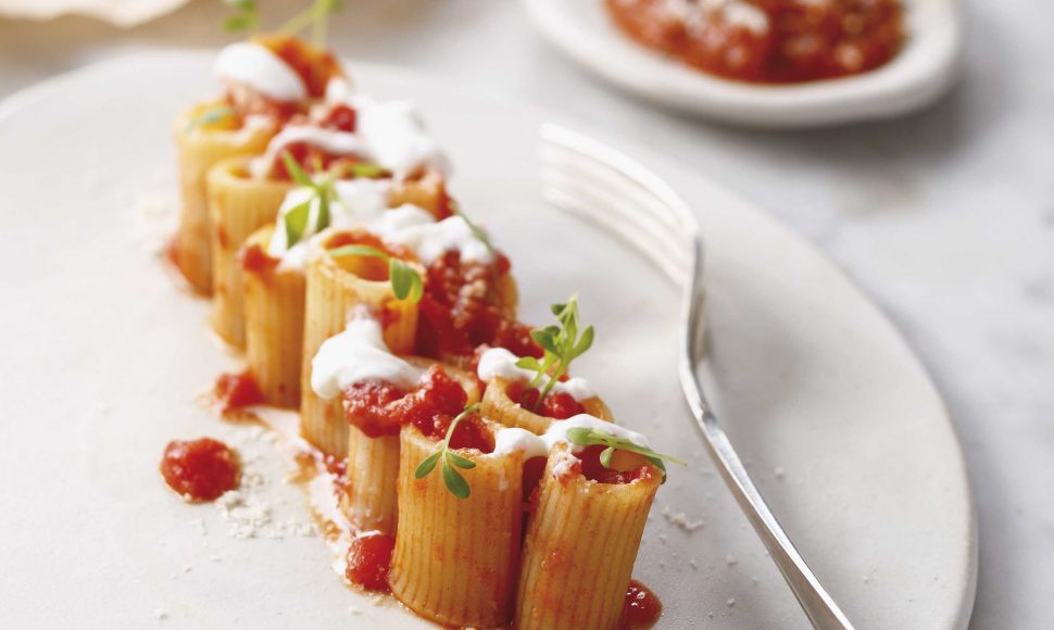 Dans une autre casserole, faites bouillir une quantité importante d’eau salée et plongez les mezze maniche dedans. Faites-les cuire jusqu’à ce qu’elles soient al dente. Pendant ce temps, coupez la burrata en petits morceaux. À la fin de la cuisson, égouttez les pâtes en conservant un peu de l’eau de cuisson. Mélangez-les avec la sauce et ajoutez l’eau de cuisson ainsi que le beurre pour bien lier. Dressez harmonieusement dans des assiettes avec les petits morceaux de burrata et des pousses de coriandre.