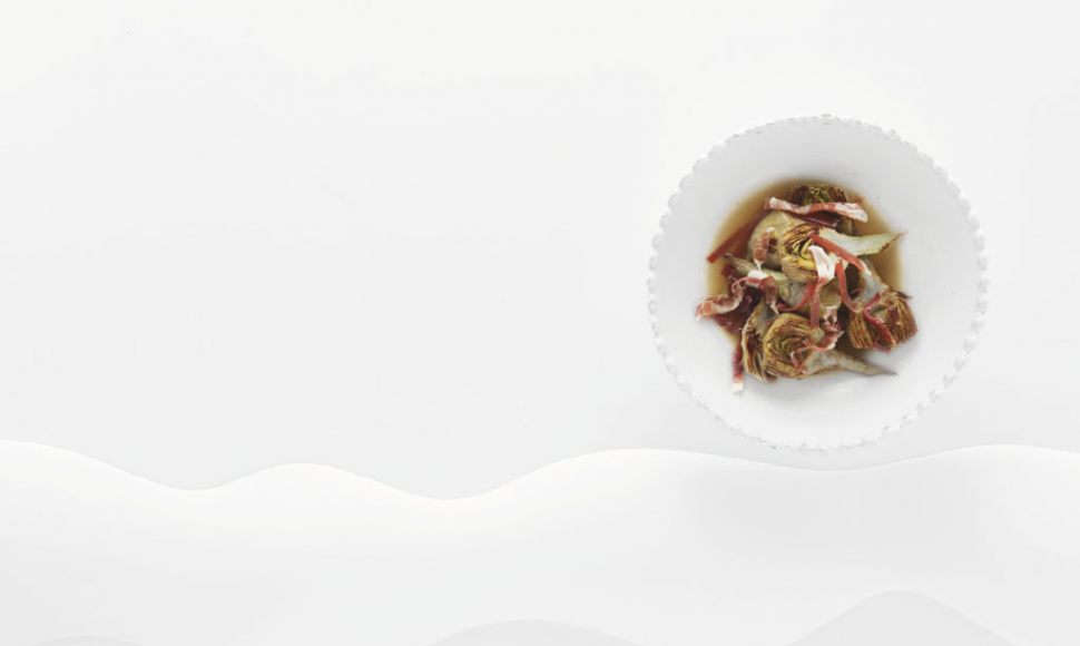 Mijotée d’artichauts, bouts de jambon et bouillon corsé