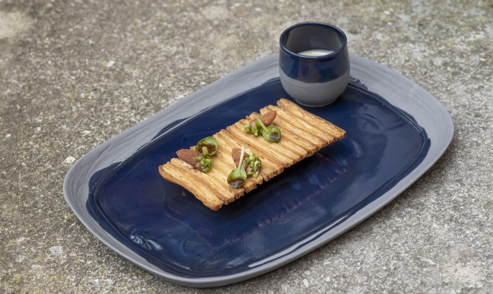 Blanchir les oeufs et le sucre puis ajouter la fécule. Porter le lait à ébullition et incorporer les oeufs blanchis. Cuire sur feu doux jusqu'à une texture de crème pâtissière. Hors du feu, ajouter le beurre et le praliné. Couler dans des petits moules carrés (5cm x 5 cm x 1cm). Réserver au froid négatif.