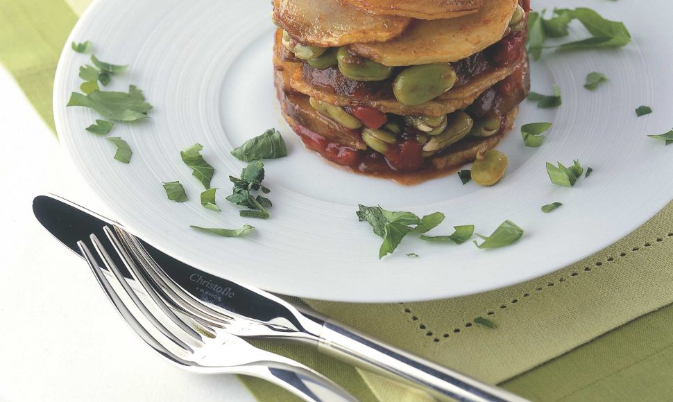 Un mille-feuille de pomme de terre, fèves et tomates, dentelles de parmesan.