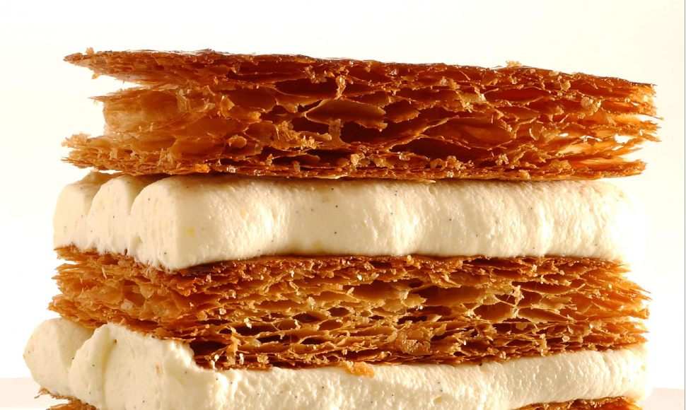 Ici, la légèreté du feuilletage doit être mise en valeur. Les feuillets doivent être abondants, séparés, aériens. Pour obtenir ce résultat, évitez de piquer la pâte avant cuisson, et veillez bien à poser la grille sur des bouchons pour laisser le feuilletage prendre tout son essor. Votre millefeuille sera délicat et fondant.